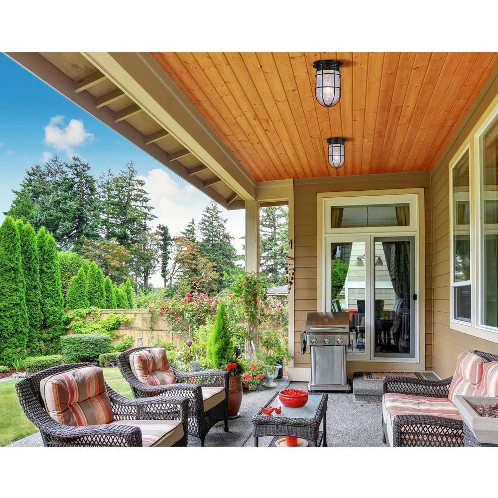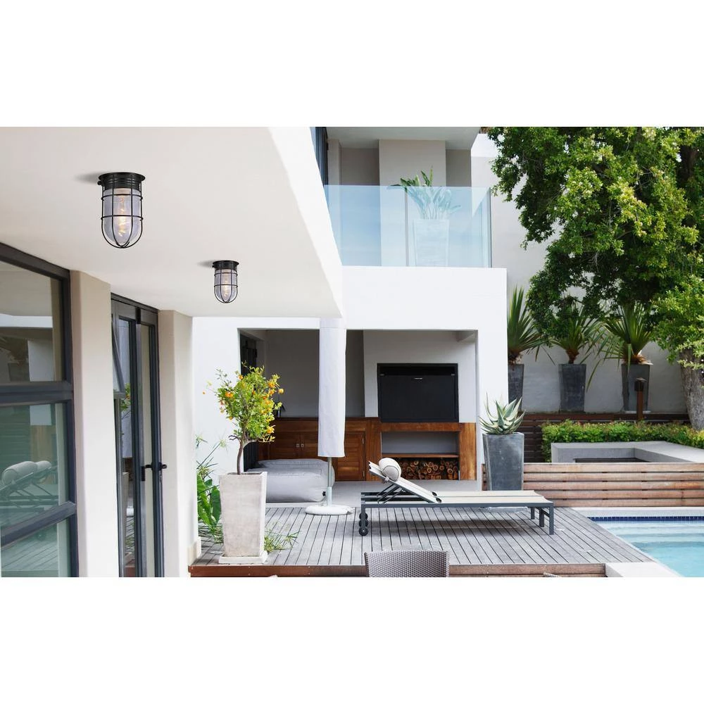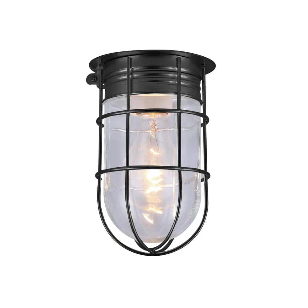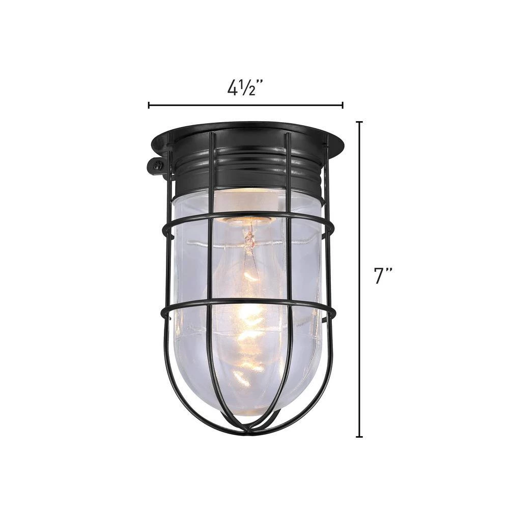 This 1-light matte black outdoor ceiling mount is unconventional and decorative. It features a simple metal cage wrapped around a clear glass shade. It’s perfect for your garage or den as well as many commercial indoor applications. Online exclusive.