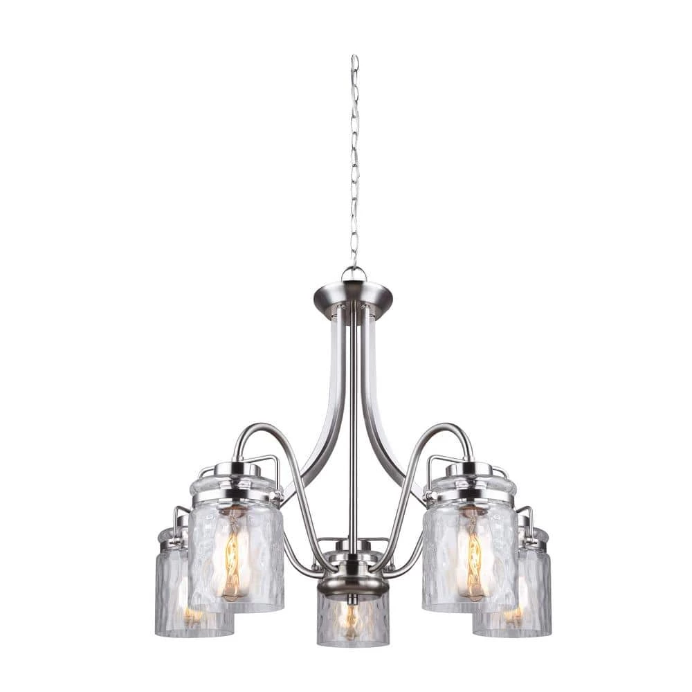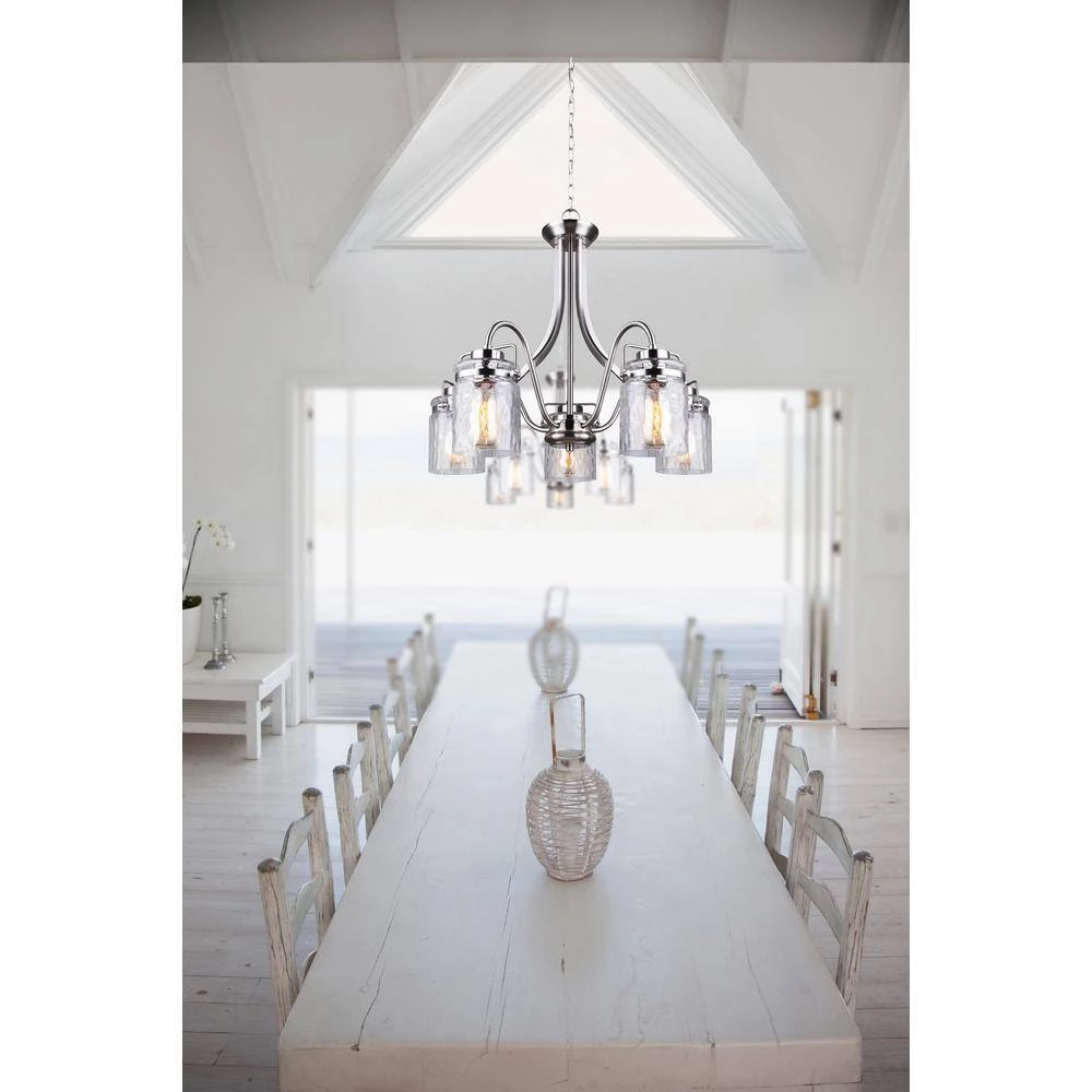 Featuring curved arms in a crisp, brushed nickel finish, the ARDEN collection marries form with industrial-chic style. Watermark glass shades braced with unique detail show off the soft glow of the Edison-style bulbs and add rustic elegance to any dining space or entryway. Create a feeling of harmony throughout your home with additional coordinating ARDEN light fixtures.