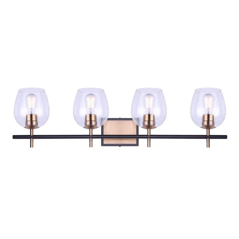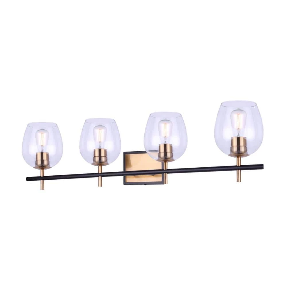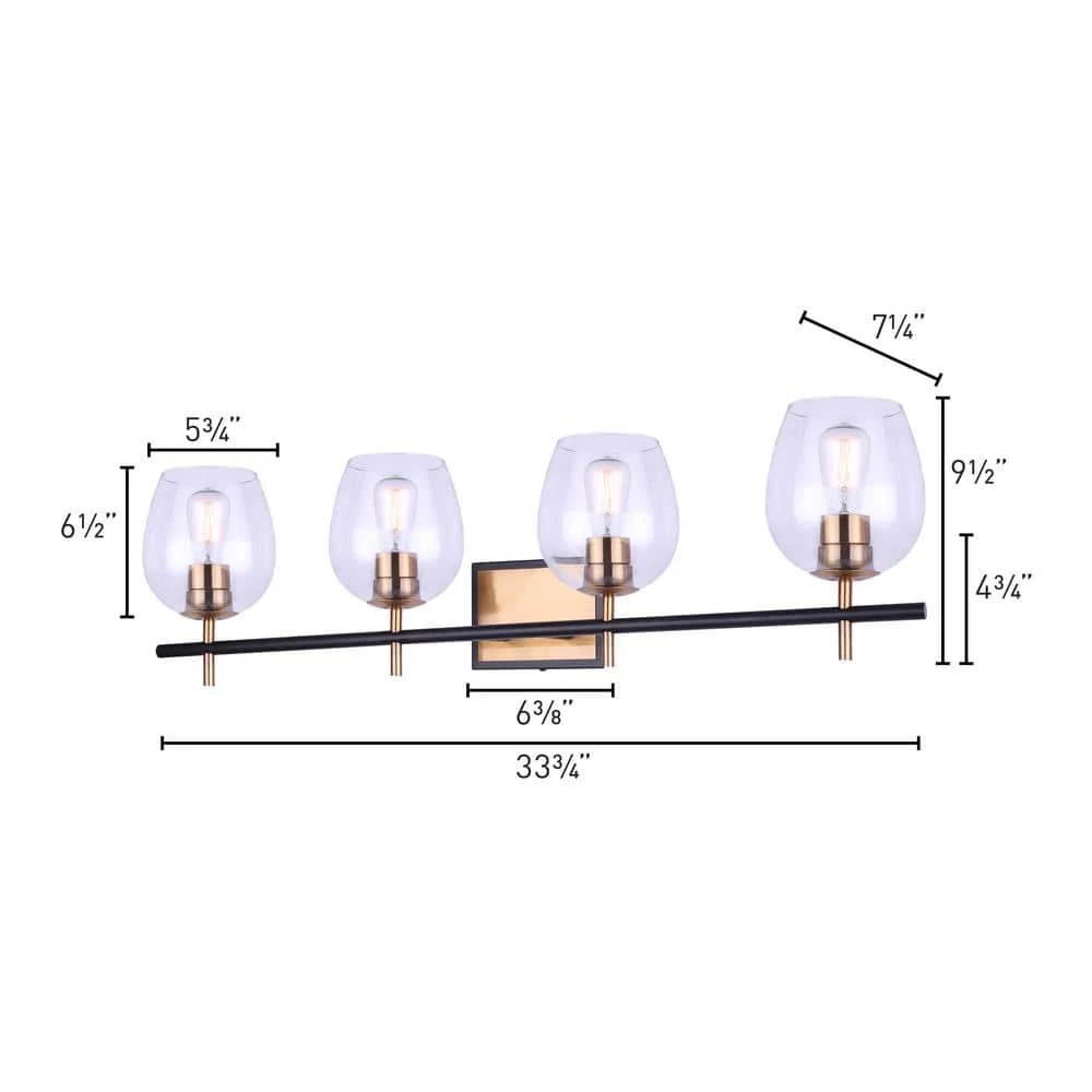 Brighten up your morning and start your day out right with the CAIN vanity light. With 4-lights shining through beautifully shaped clear glass shades and the sleek combination of gold and matte black finishes, CAIN will not only emit the right amount of light, but it will add an undeniable style to your bathroom or powder room. Available in a matte black finish. Shop the entire vanity collection including a single light wall sconce, 2-light and 3-light vanity.