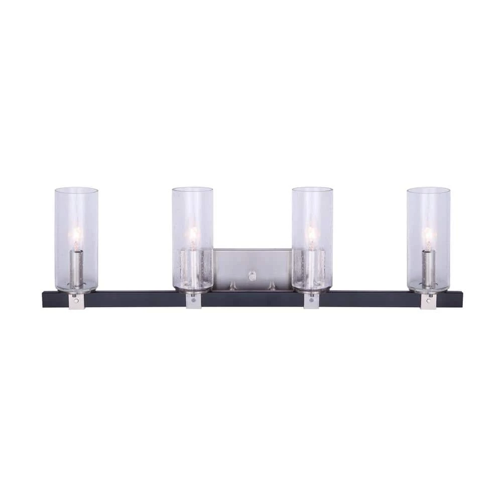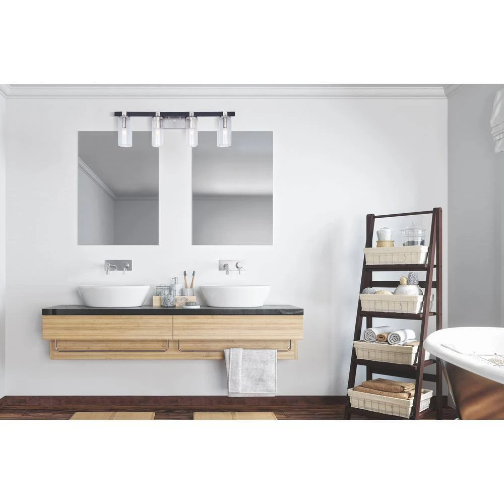 Create a relaxing atmosphere under the glow of the Cedar 4-light vanity as you escape reality and enjoy a warm bubble bath. Cedar comes in a modern industrial style matte black and brushed nickel finish, offering a romantic side with its seeded glass shades. Versatility is key as it can be installed as an up light or downlight.