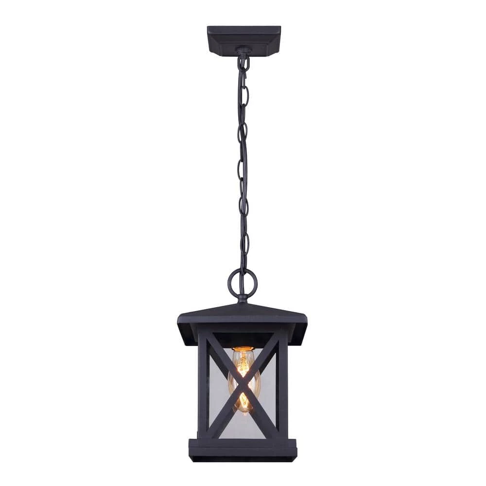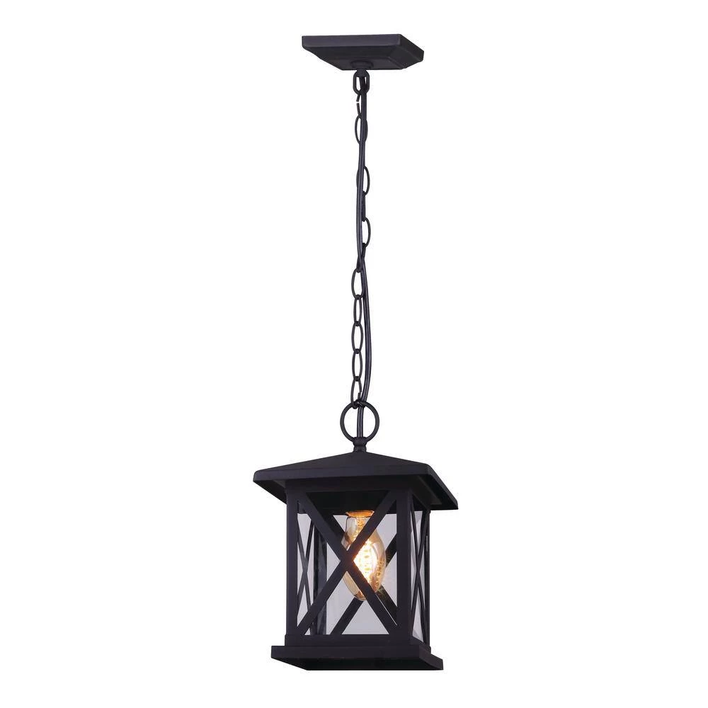 The ELM family creates a welcoming ambiance to any outdoor space in need of a simple yet stylish design. ELM combines an on-trend black finish with clear glass and a decorative crises cross design element to make it stand apart from your traditional outdoor lighting. This hanging pendant is perfect for any outdoor occasion.