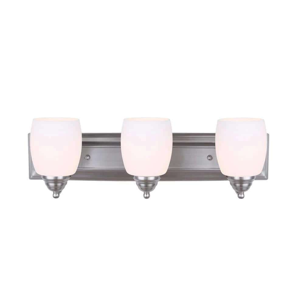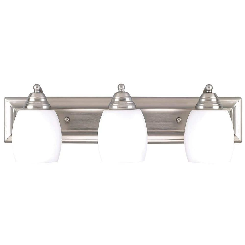 The GRIFFIN vanity collection features this 3-light vanity that is suitable for many bathroom applications. This brushed pewter vanity fixture is ideal over your bathroom mirror and can be installed as an up or down light. The opal glass shades sit perfectly on top of the simple but solid metal base.