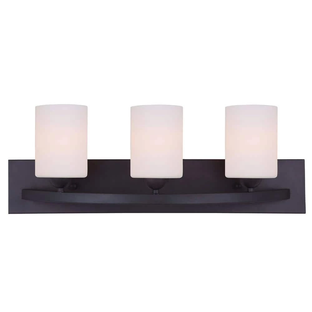 The HAMPTON vanity collection features this transitional 3-light vanity that is suitable for many bathroom applications. This oil rubbed bronze vanity fixture is ideal over your bathroom mirror and can be installed as an up or down light. The flat opal glass shades sit perfectly on top of the simple but solid vanity plate. A 2-light and 4-light version is also available online.