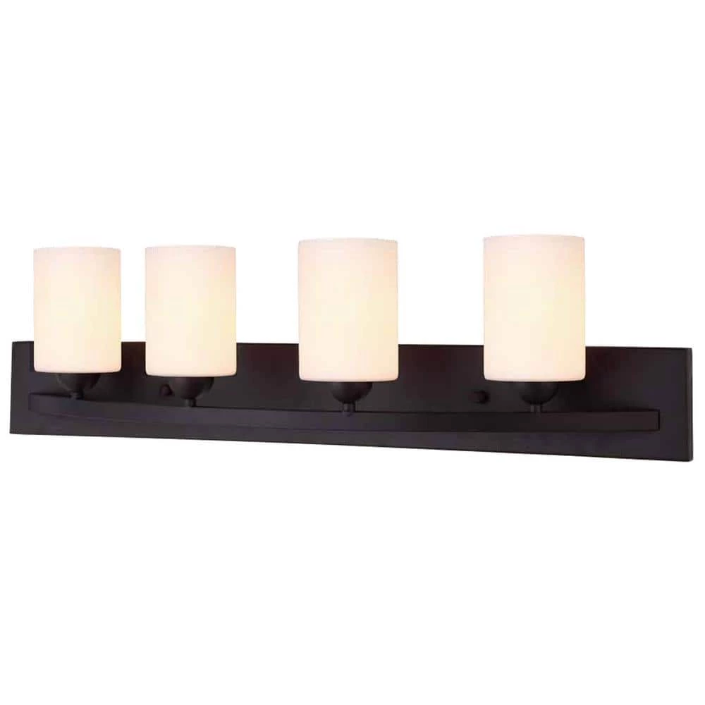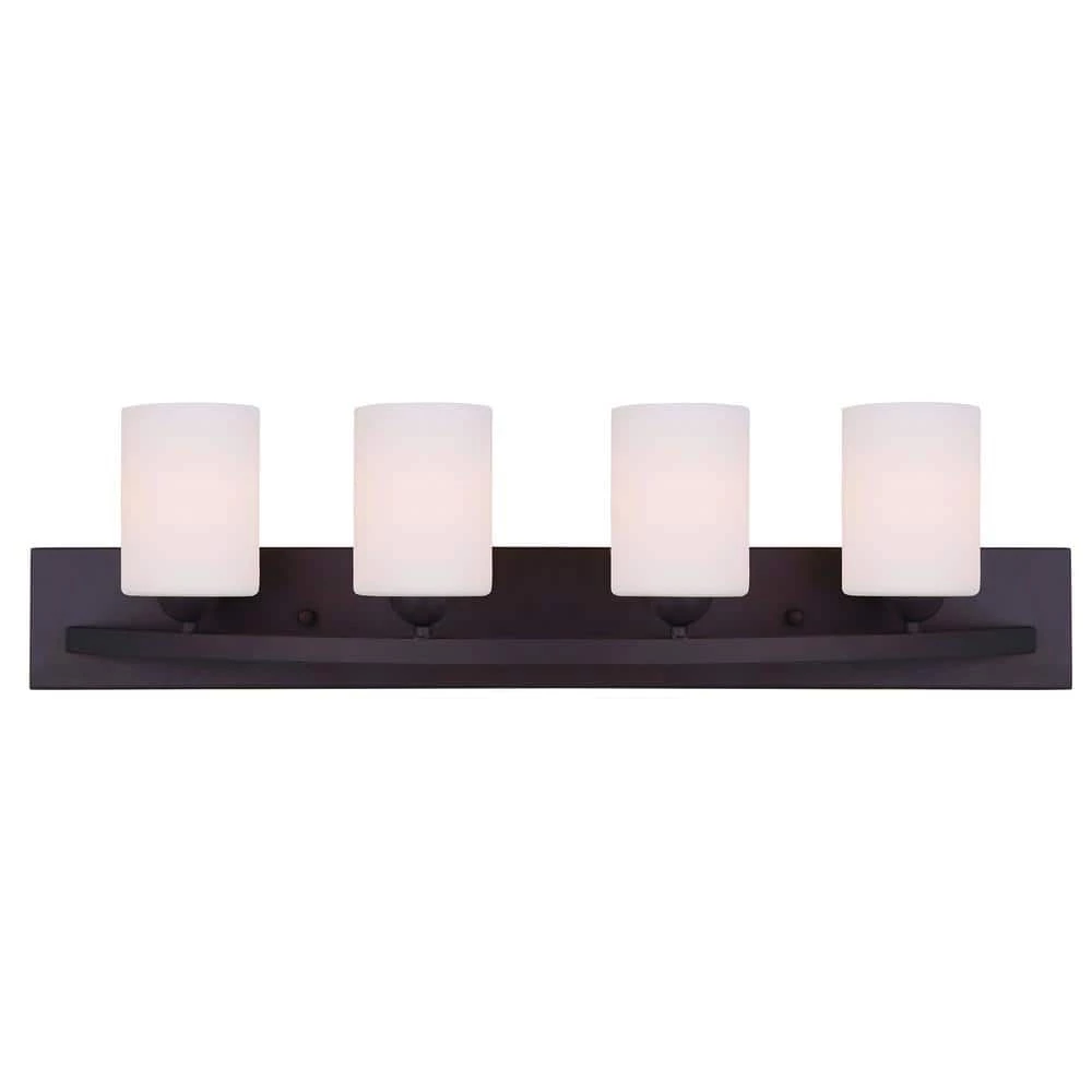 The HAMPTON vanity collection features this transitional 4-light vanity that is suitable for many bathroom applications. This oil rubbed bronze vanity fixture is ideal over your bathroom mirror and can be installed as an up or down light. The flat opal glass shades sit perfectly on top of the simple but solid vanity plate. A 2-light and 3-light version is also available online.