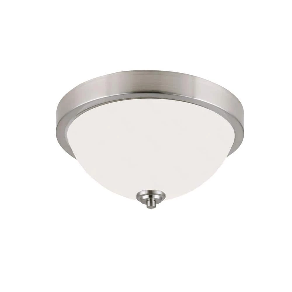 The River flush mount features a transitional look in a brushed nickel finish. The flat opal glass shade diffuses light evenly and the simple design adds a decorative touch. It’s ideal for the bedroom and hallways.